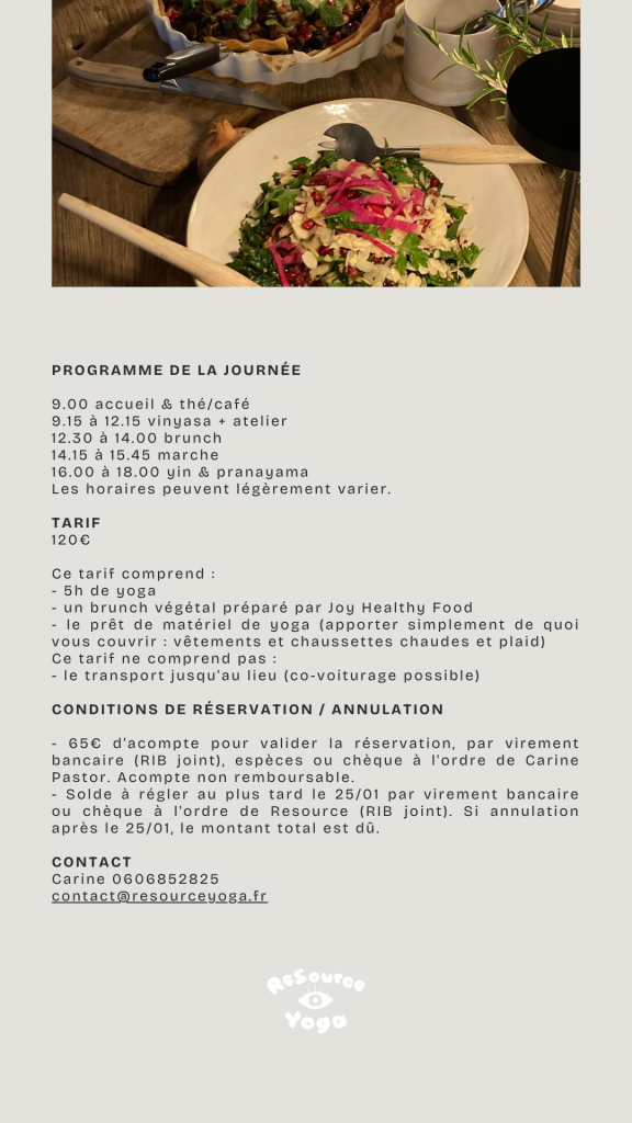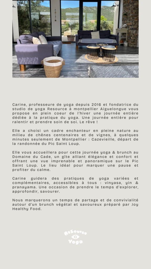 JOURNEE YOGA & BRUNCH au Pic Saint Loup – Dimanche 1er février Laisser un commentaire Annuler la réponseCommentEnter your name or username to comment Enter your email address to comment Saisir l’URL de votre site (facultatif) Δ Vous devriez également aimer NOEL : le studio sera fermé du mercredi 24/12 au samedi 27/12 inclus et du mercredi 31/12 au vendredi 2/01 inclus décembre 10, 2025 Masterclass Yoga Inversions à Montpellier : vers Pincha Scorpion avec Cécé Schwag avril 29, 2025 LES ATELIERS LABORATOIRE DE POSTURES avec Carine octobre 22, 2025